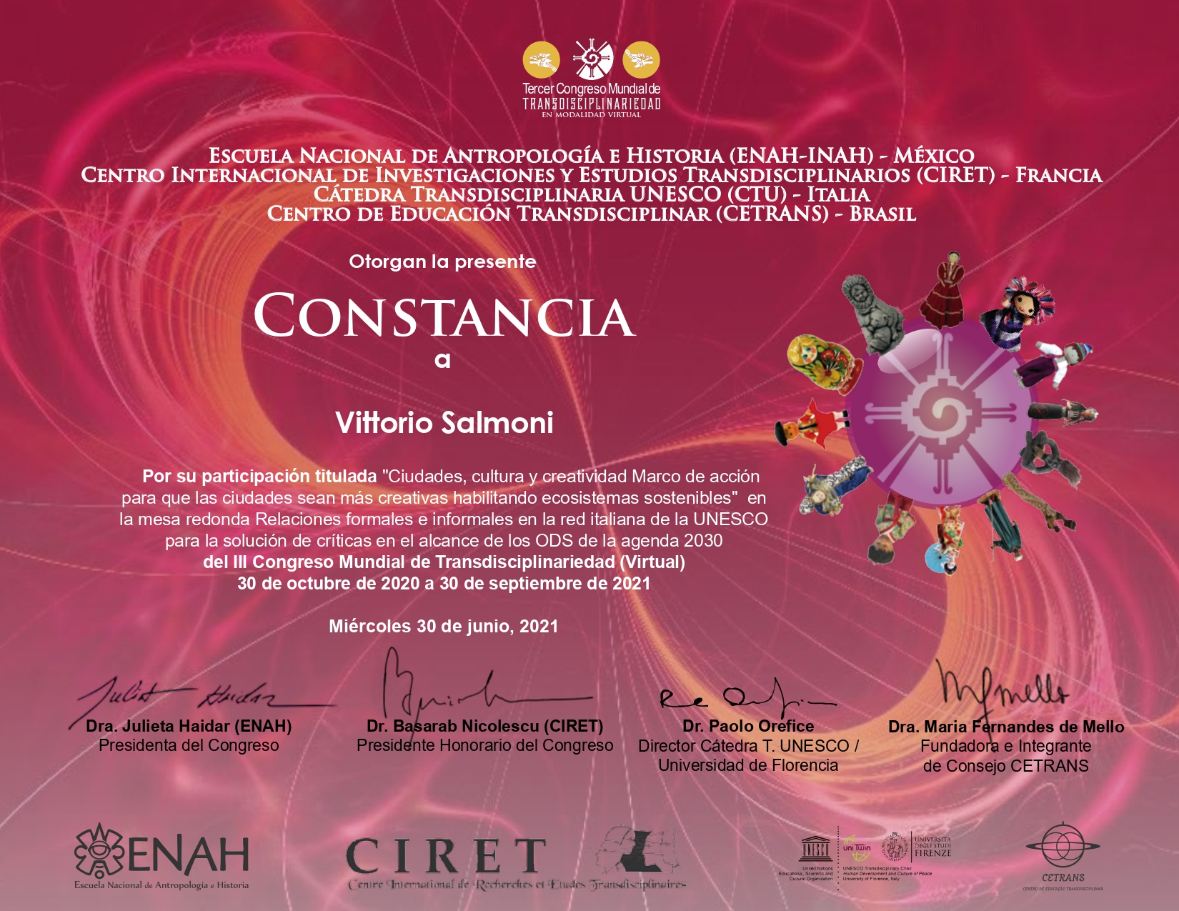 Intervento al congresso transdisciliplane UNESCO. Partecipazione Vittorio Salmoni alla “città,